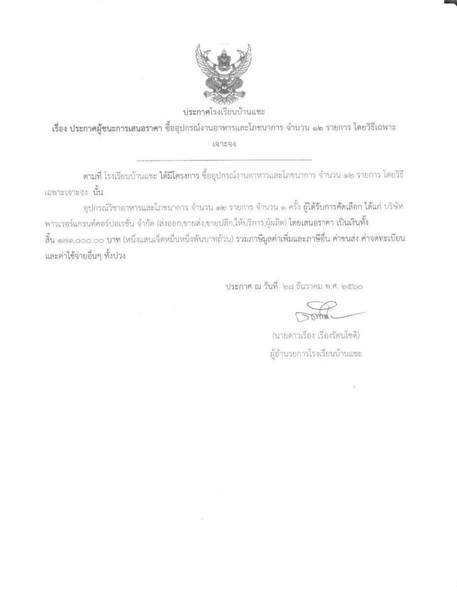 ประกาศผู้ชนะการเสนอราคา ซื้ออุปกรณ์งานอาหารและโภชนาการ จำนวน 12 รายการ โดยวิธีเฉพาะเจาะจง